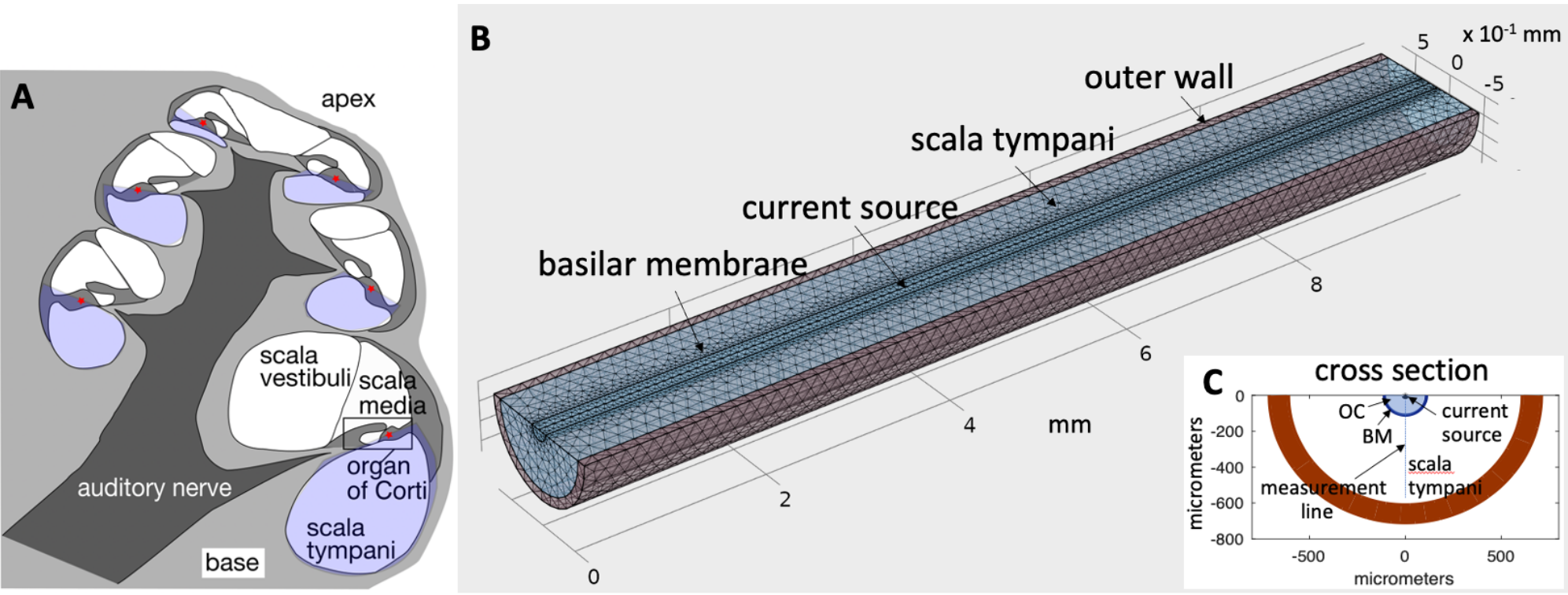 This paper presents a finite element model of the voltage in the Scala Tympani of the sensitive gerbil cochlea, in response to the current generated by outer hair cells transduction. This voltage, often called the cochlear microphonic, is a complicated summation of many current source contributions along the length of the cochlea, weighting local contributions more heavily. We find that our model can replicate cochlear microphonics similar in shape and magnitude to those measured experimentally so long as a) the transducer current is more sharply tuned than basilar membrane motion, and b) the magnitude of the transducer current is about four times larger in vivo than what has been measured ex vivo. We also show that we can match experimental responses at high frequencies by damaging the modeled cochlea's base, consistent with the basal damage seen via displacement data in many gerbil preparations. This work was published in Biophysical Journal in 2021. The manuscript and figures are available as PDFs on my github.| [1] | Frost, Janjušević, Strimbu and Hendon (2023) |
