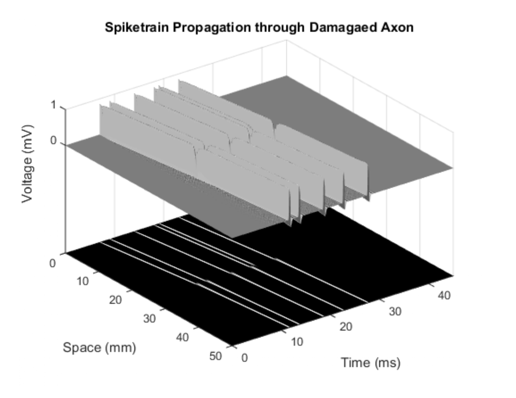 This paper explores a model for focal axonal swelling, a common form of damage resulting from traumatic brain injury or neurodegenerative disorders. A common model for the damage is a Hodgkin-Huxley neuron with varying width, which manifests as a system of partial differential equations whose solution is computationally expensive. We have developed a method that rapidly predicts the dynamics when the input and output of the system is interpreted as a spike train. This allows for network-level simulations. In small feedforward networks, we show that pre-synaptic inhibition appears to reduce the impact of damage on the network's frequency discriminating abilities. This work was published in the Journal of Computational Neuroscience in August, 2023.2023 - Reconstruction of transverse-longitudinal vibrations in the organ of Corti complex via optical coherence tomography[3]