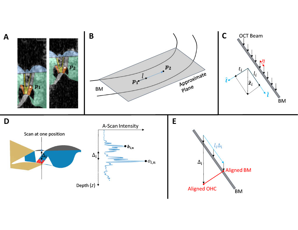 This paper provides a method for reconstructing 2- and 3-D displacement maps in the Organ of Corti complex. Instead of using advanced hardware or limiting volume processing techniques, the method relies on the physiological properties of the cochlea. In particular, it uses the phase of the traveling wave along the basilar membrane to register positions between different viewing angles. We present one data set in which we were able to reconstruct transverse and longitudinal components of the displacement response at the outer hair cell-Deiters cell junction in the gerbil cochlea. This work was published in the Journal of the Acoustical Society of America in February, 2023.2022 - Using volumetric optical coherence tomography to achieve spatially resolved organ of Corti vibration measurements[4]